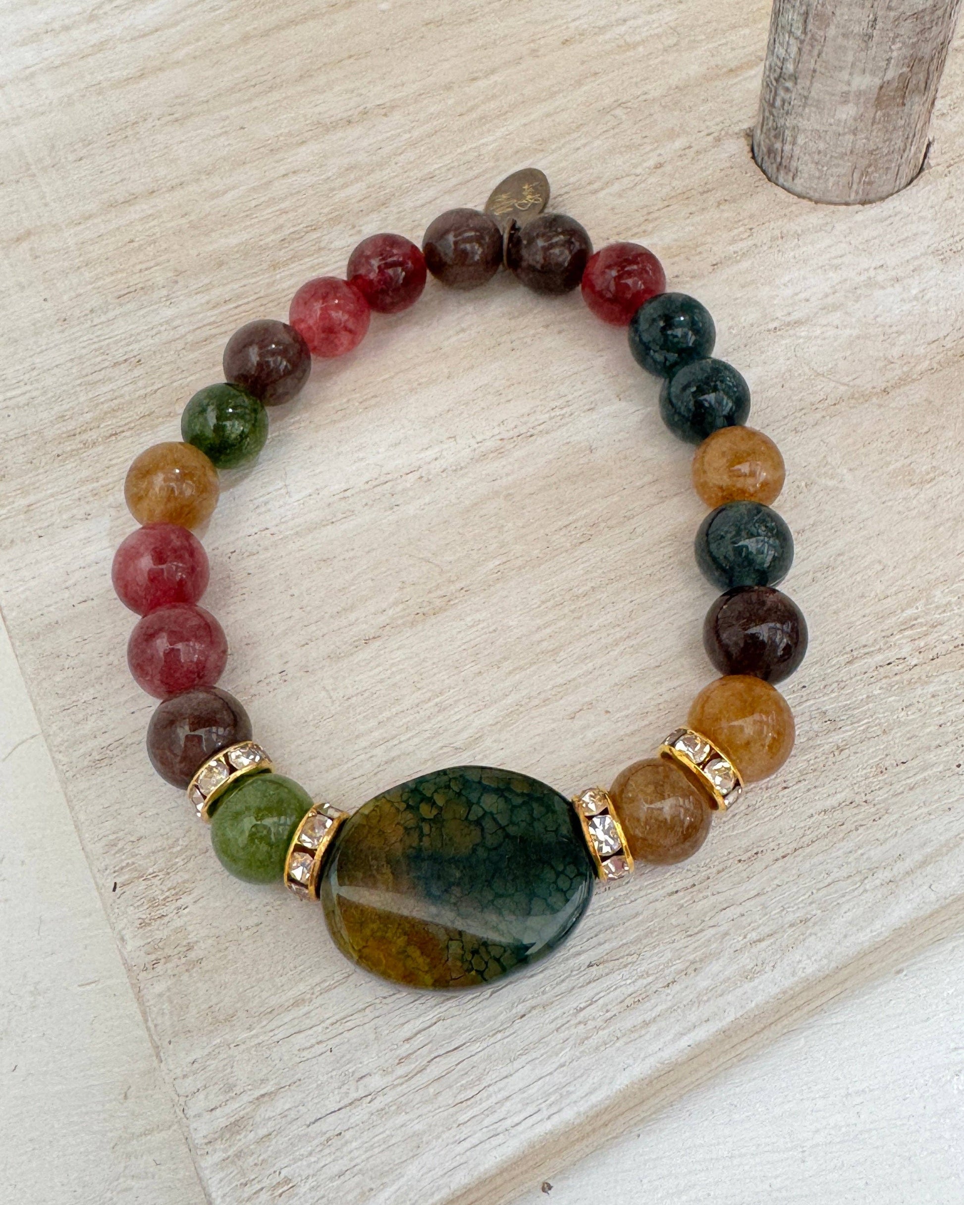 Rainforest Bloom is a celebration of colour, energy, and natural beauty. This beautiful bracelet features multicolour tourmaline beads – each one rich with earthy tones and joyful vibrancy – accented with sparkling crystal spacer beads for a touch of glam.